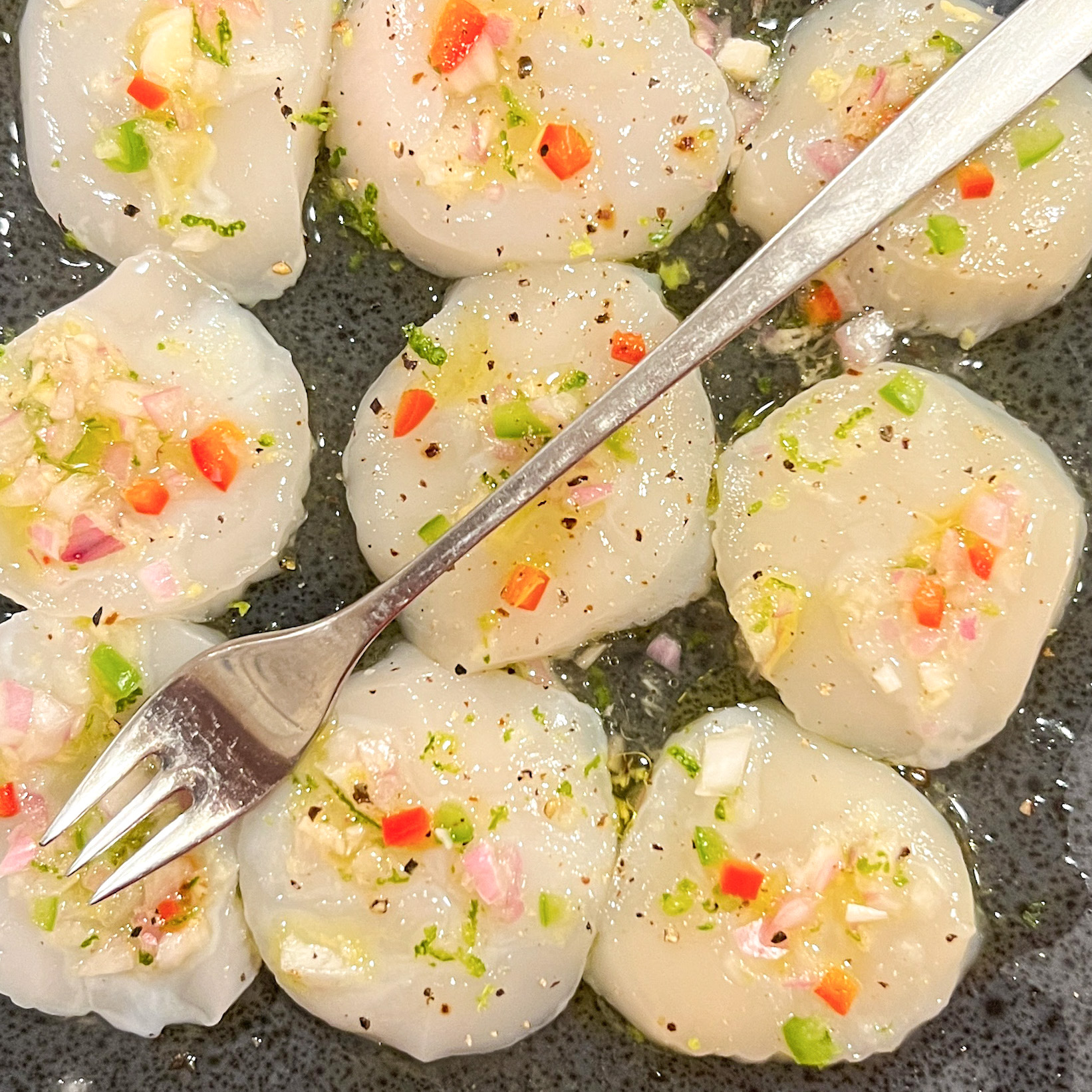 • With a sharp knife, carefully slice the scallops very thin (about 1/8" thick). Spread the slices on 4 servings plates.