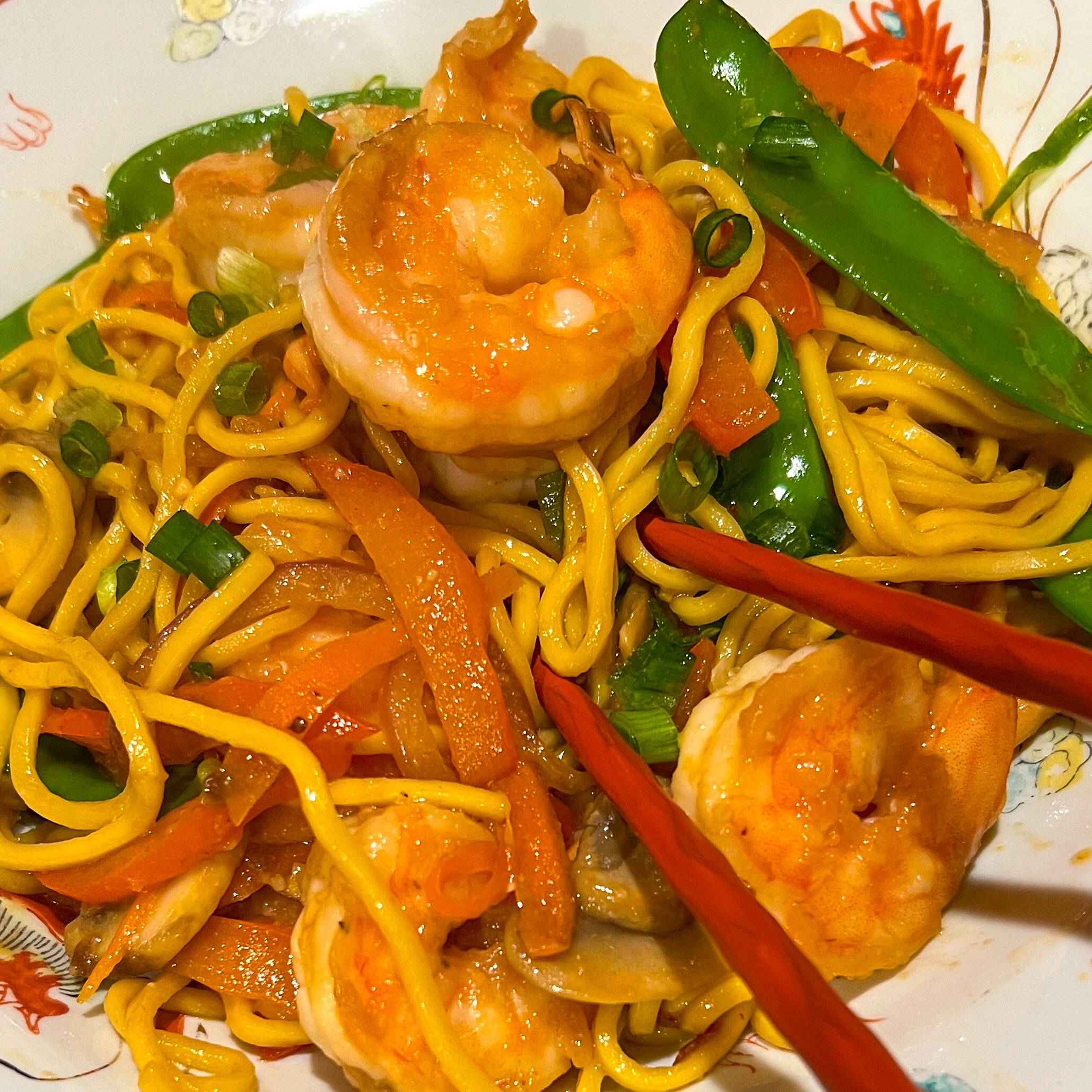 - When the vegetables are nearly cooked, return the shrimp to the wok, cook for a minute or two to cook through. Add the well mixed stir fry sauce. Stir and add the noodles. Tongs are useful at this point to spread noodles out and incorporate them into the vegetables and sauce. Toss in snow peas and scallions, stir and serve.