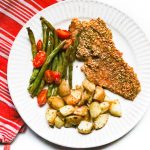 Place fish in oven and cook for 8 minutes, or until the fish can be flaked easily with a fork. If you time it right, the potatoes, tomatoes and green beans will done at this time too!