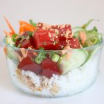Divide cooked rice into desired amount of bowls. Evenly layer each bowl according to order: lettuce, marinaded tuna/salmon, cucumber, carrot, and avocado. Sprinkle with chopped cilantro, green onions, and sesame seeds as desired. Drizzle with Sriracha Mayo. Serve immediately.