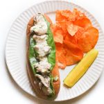 Toast the rolls and line the insides with lettuce. Add the monkfish, chopped celery and chives to the bowl with the mayonnaise mixture; gently toss. Divide the monkfish salad among the rolls. Serve with pickles and the potato chips.